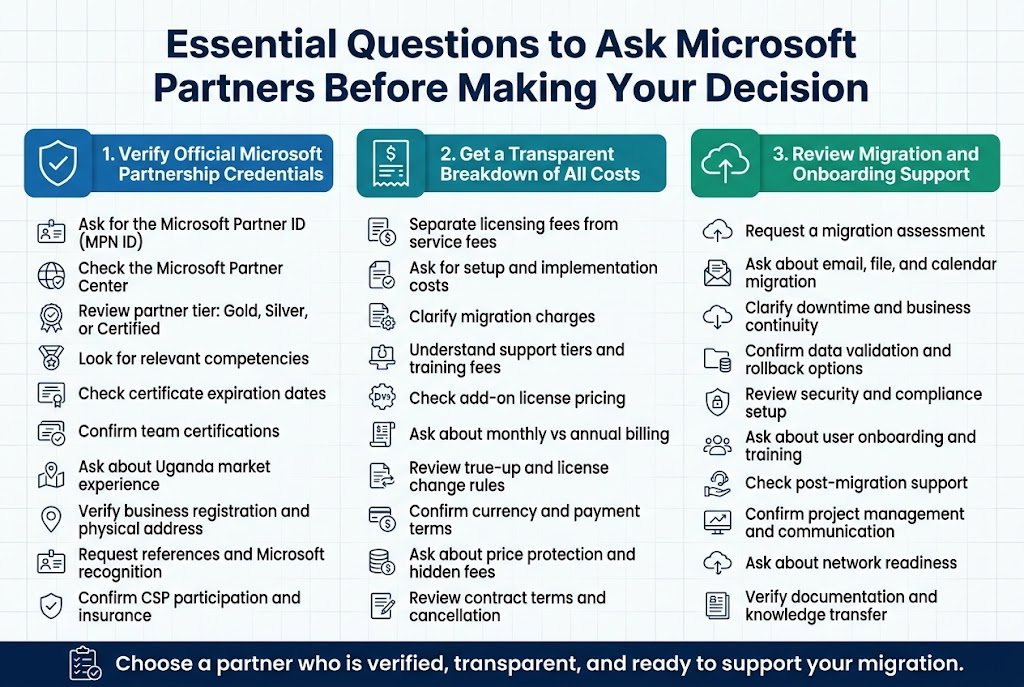 Don’t forget to ask about their experience specifically with businesses in Uganda. Microsoft 365 implementation can vary significantly based on local infrastructure, internet connectivity patterns, and regulatory requirements. A partner who understands the unique challenges of operating in the Ugandan market will be better positioned to design a solution that works reliably for your organization.